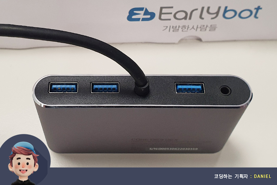 맥북 멀티허브 웨이코스 씽크웨이 CORE D53 하단에는 맥북과 연결되는 USB 케이블과 USB 3.0 3포트 그리고 미팅(Zoom, google meet)과 허들에 사용하면 좋은 AUDIO단자가 있습니다.