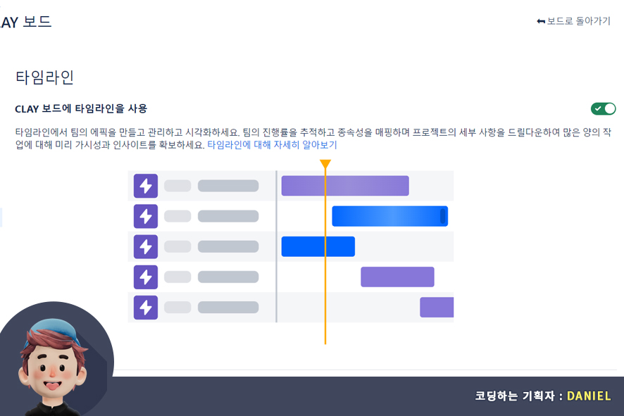 지난 포스팅 지라(JIRA)의 사용방법에 대해 설명해 드렸습니다. 이번 포스팅은 프로젝트 일정을 관리하기 위한 타임라인에 대해 알아볼까합니다. 타임라인의 일정을 설정해 두면 일정관리(프로젝트의 긴 여정)를 좀 더 원활하게 할 수 있습니다. 또한 지라(JIRA) Software를 사용하면, 일정관리 뿐만 아니라 IT프로젝트를 시작부터 끝까지 관리할 수 있으며, 컨플루언스와 함께 사용한다면 프로젝트를 진행하면서 생긴 문서 또한 정리가 가능하기 때문에 너무 좋은 프로그램이라고 생각합니다.