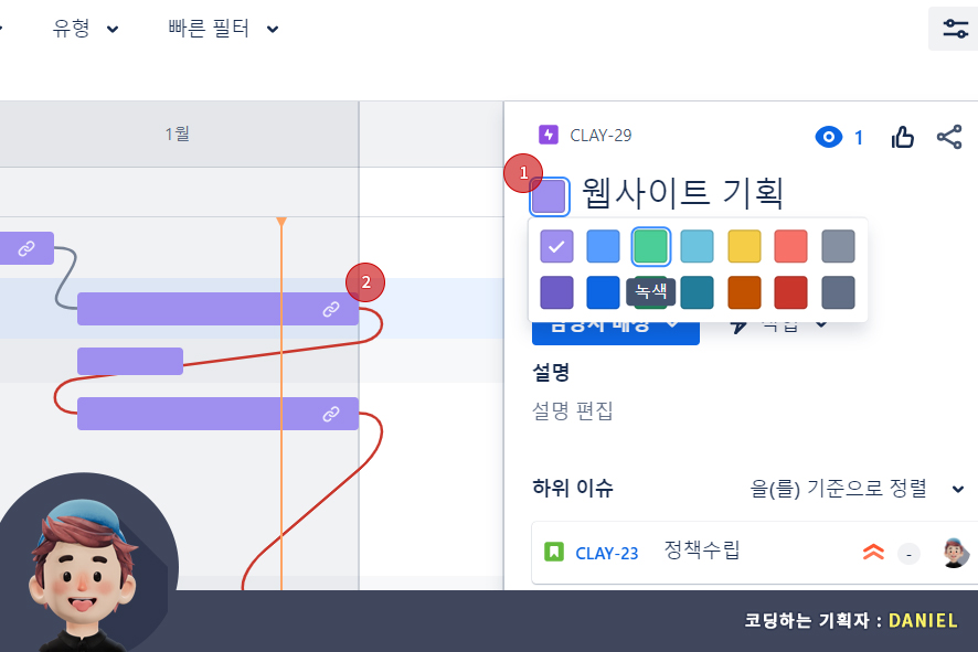 타임라인에서 이슈를 선택해서 색상 역시 변경할 수 있습니다. 기획, 디자인, 개발, QA까지 파트별로 색상을 구별하니 시각적으로도 구별이 되어서 너무 좋습니다.