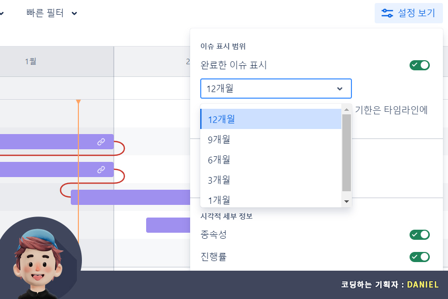 - 완료한 이슈 표시 : 완료된 이슈를 표시할 지 여부를 결정합니다. 1, 3, 6, 9, 12개월 단위로 설정할 수 있습니다.