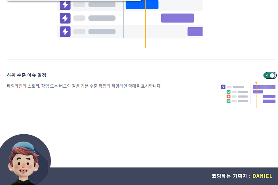 타임라인을 보는 방식은 사람마다 다릅니다 그렇기 때문에 지라(JIRA)에서는 다양한 보기 옵션이 존재하는데요. 위의 사진에서도 볼 수 있듯이 시각적으로 구분할 수 있게 설정을 해두면 일정관리를 수월하게 할 수 있습니다. 설정할 수 있는 항목은 아래와 같으며, 이에 대한 설명도 안내해 드렸습니다.