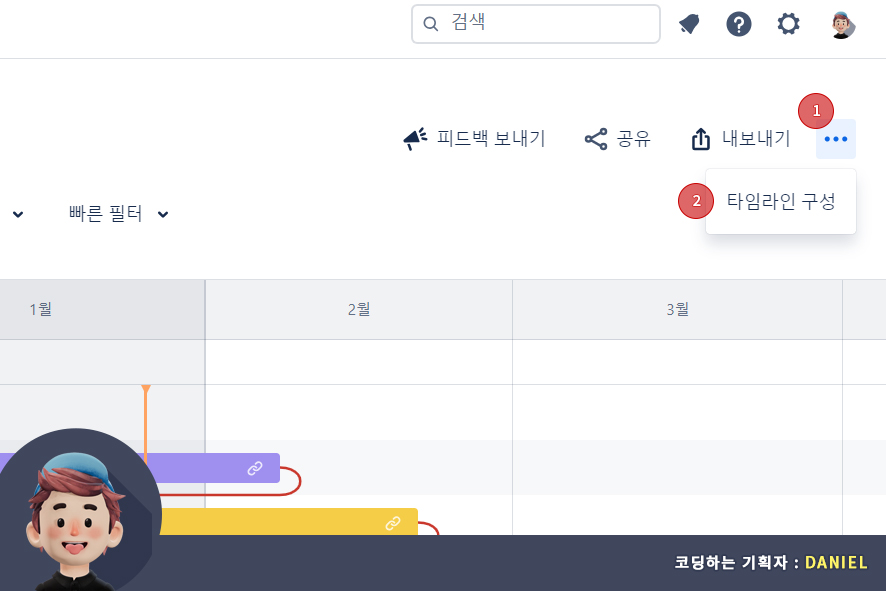 지라 우측 상단의 메뉴(⋯)를 선택(1번)하고 타임라인(timeline) 구성을 선택(2번)합니다. 스크롤을 내려 하위 수준 이슈 일정을 활성화 하고, 좌측의 타임라인(timeline) 메뉴를 선택 또는 뒤로가기를 선택해서 타임라인으로 복귀한 뒤 하위 이슈의 일정을 입력합니다.