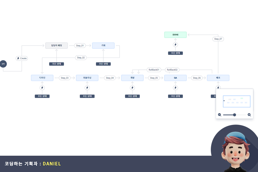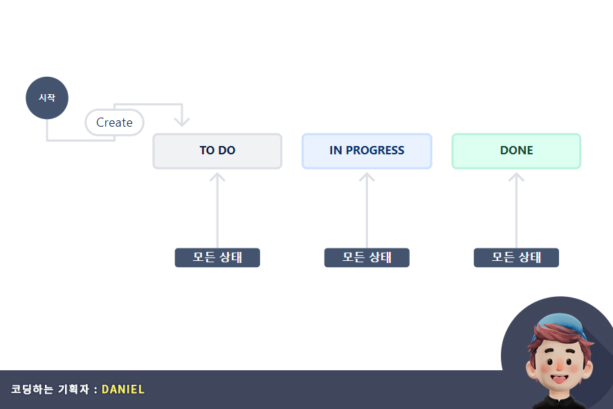 - 규칙(Rule) : 상태(status)와 상태(status)를 전환(Transition)하는 규칙을 의미합니다. 정해진 규픽을 충족해야지만 다음 상태로 전환할 수 있습니다.