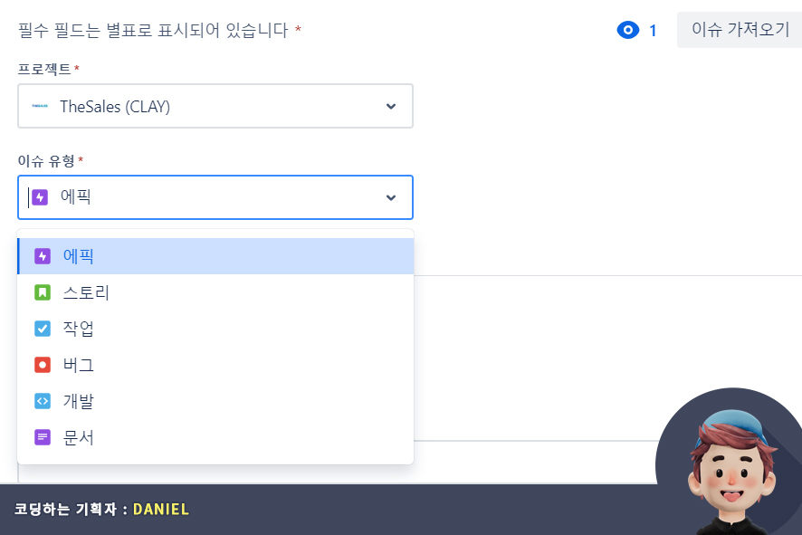 웹사이트 구축 프로젝트이기 때문에 개발, 문서의 이슈 유형을 추가했습니다. 이슈유형을 추가하는 방법에 대해서는 새로운 포스팅에서 안내해 드리겠습니다.