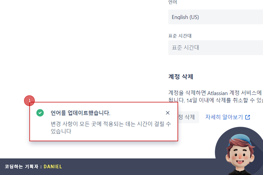 사용자 인터페이스 언어 설정이 마무리 되면 왼쪽 하단에 언어를 업데이트 했다는 안내 창(1번)이 뜹니다.