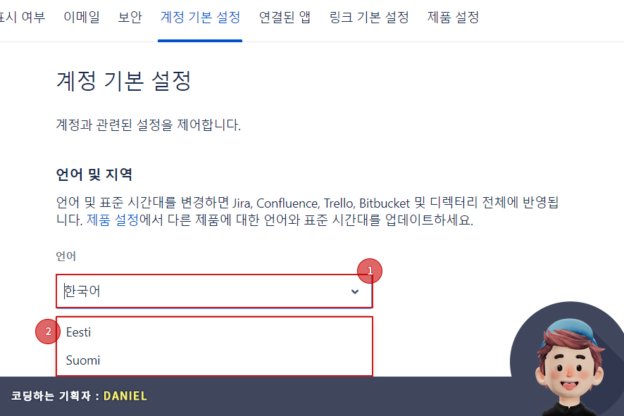 아틀라시안 개인 설정에서 변경되는 언어 설정 값은 지라(JIRA). 컨플루언스(Confluence), 트렐로(Trello), 비트버킷(Bitbucket)과 디렉토리 전체에 반영됩니다. 쉽게 말해 아틀라시안에서 제공하는 소프트웨어의 기본 언어의 기본 값이 변경된다는 것이죠 ! 자 그럼 이제 언어를 변경해 볼까요? 언어 선택 박스(select box)를 선택(1번)하고, 드롭다운(drop down)메뉴 중에 변경하실 언어를 선택하(2번)시면 됩니다.