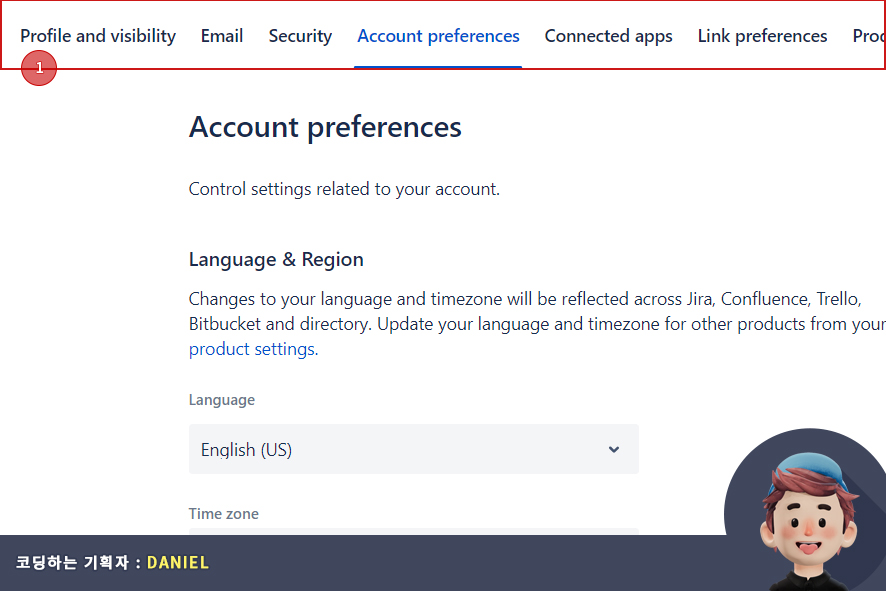 아틀라시안(atlassian) 계정 설정(atlassian Account)으로 이동하면, 프로필 및 표시 여부(Profile and visibility) 화면으로 이동하게 됩니다. 이제 사용자 인터페이스(UI : user interface) 언어(Language) 변경을 위해 계정 기본 설정(Account preferences) 탭으로 이동합니다.