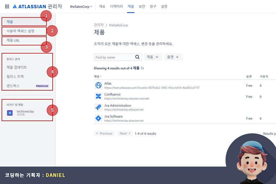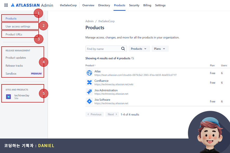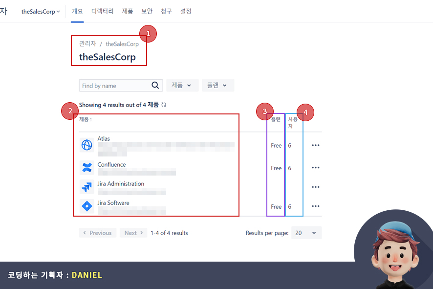 아틀라시안 관리자 메뉴로 이동하면 가장 먼저 보이는 항목은 바로 개요(Overview)화면 입니다. 개요(Overview) 화면에서는 아틀라시안(Atlassian)을 사용중인 조직 이름(organization name)과 제품(products), 플랜(plan), 사용자(user) 정보를 볼 수 있습니다.