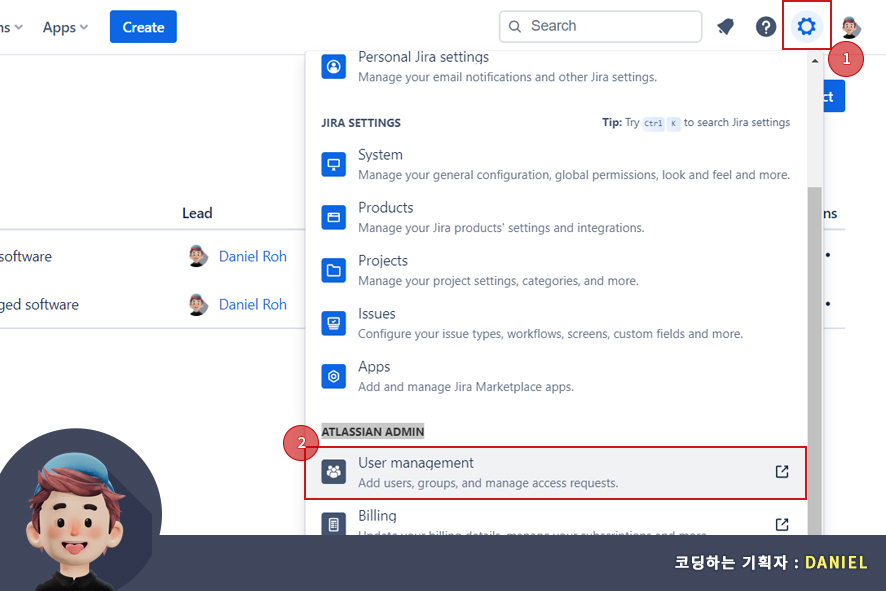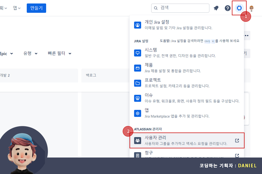 먼저 아틀라시안 관리자 페이지로 이동하기 위해서는 두 가지의 방법이 있습니다. 먼저 왼쪽 상단 전체 메뉴에서 관리자(administration) 메뉴를 선택해서 이동하는 방법과 우측 상단의 설정 모양의 아이콘을 선택한 뒤 스크롤을 내려서 아틀라시안 관리자(Atlassian admin) 메뉴의 사용자 관리(User managment)페이지로 이동하는 방법입니다.