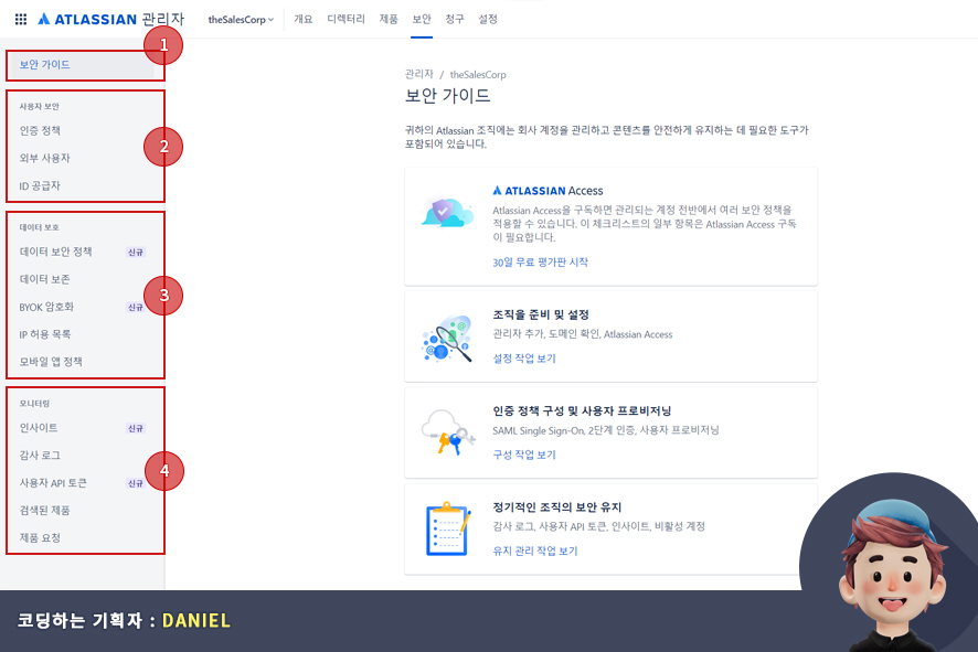 아틀라시안 관리자(atlassian admin) 보안(Security) 탭에서는 보안 가이드, 사용자 보안, 데이터 보호, 모니터링과 같은 보안 기능을 수행합니다.