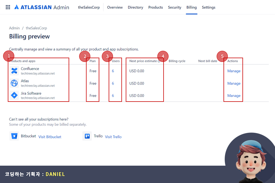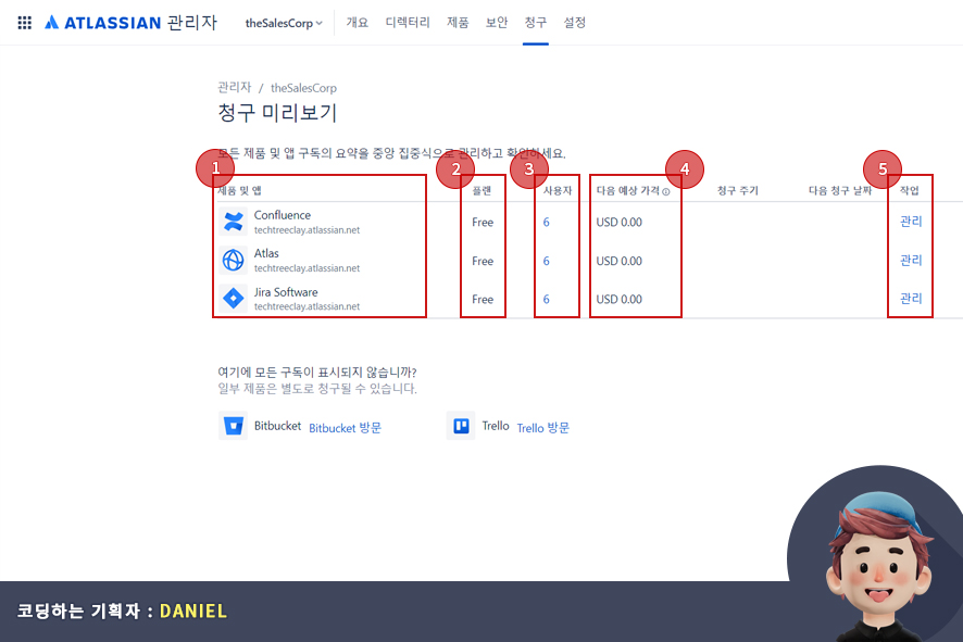 청구(Billing) 메뉴에서는 아틀라시안의 사용하고있는 제품 및 앱을 나타내며, 구독하고 있는 사용자, 다음 얘상 가격, 청구 주기(년/월) 다음 청구 날짜, 작업(구독하고 있는 제품의 디테일 정보와 플랜을 변경)을 관리하고 있습니다.