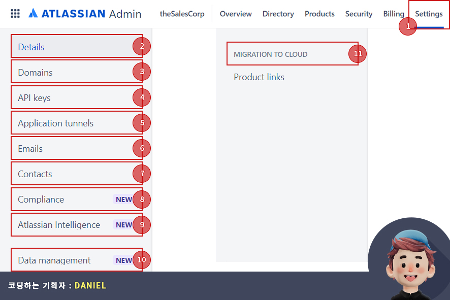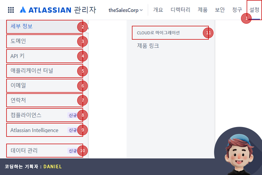 아틀라시안 관리자(atlassian admin)의 설정(settings)에서는 관리자 메뉴에서 설정한 세부 내용들을 설정 및 관리할 수 있습니다.