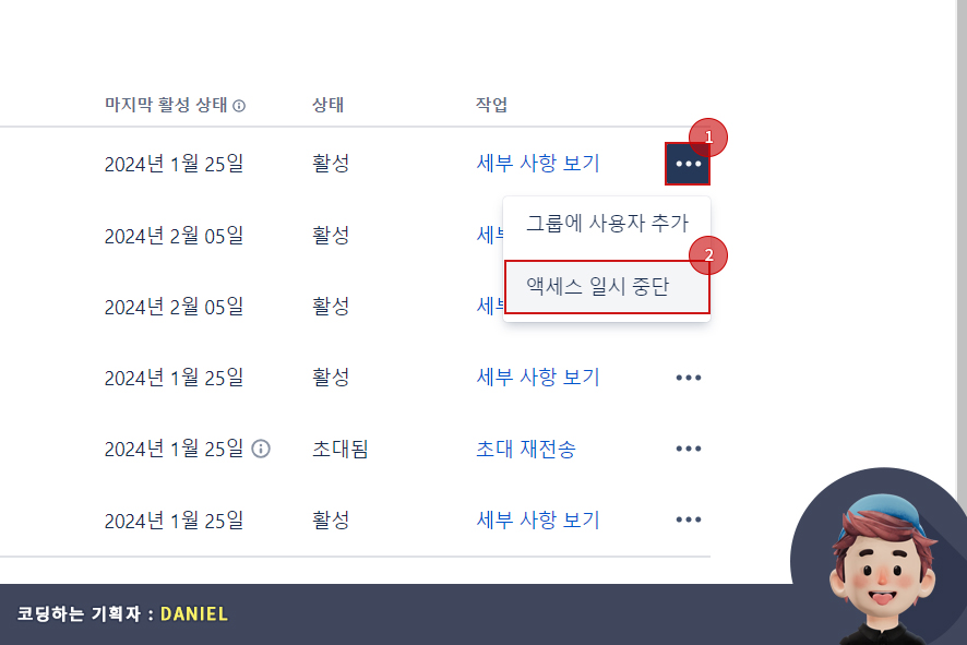 사용자 접근(access : 엑세스) 권한을 일시중단으로 변경하기 위해서는 먼저 접근 권한을 제한할 사용자의 제일 우측의 ( ⋯) 메뉴 버튼을 클릭 후 드롭다운(Drop down) 메뉴에서 엑세스 일시중단 메뉴를 선택하시면 됩니다.