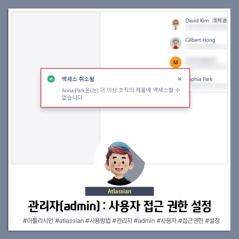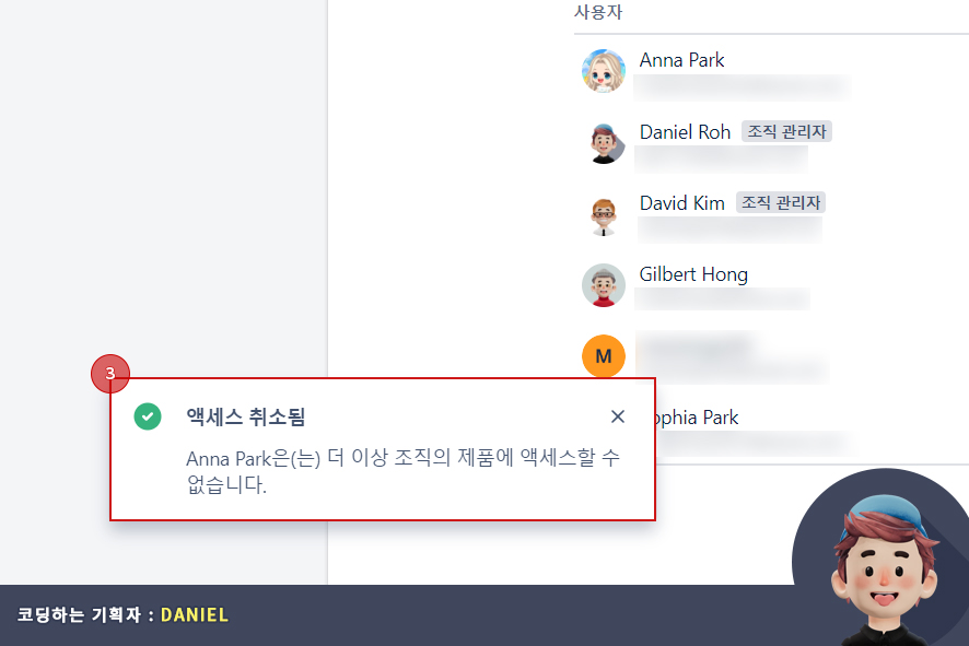 자 이제 사용자 접근(access) 권한이 취소 된것을 좌측 하단의 팝업창으로 확인할 수 있습니다.