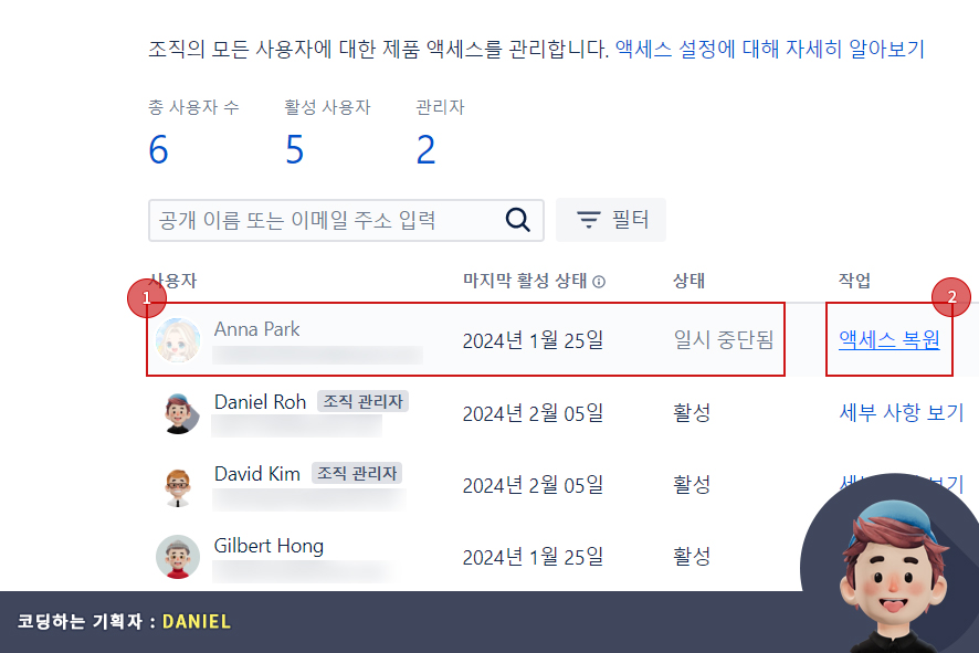 자 이제는 접근(access) 권한이 없던 사용자(user)에게 엑세스 복원을 하는 방법에 대해 알아보겠습니다. 먼저 접근이 일시 중단된 사용자를 확인합니다. 이 때 사용자가 조회되지 않는다면 아틀라시안 관리자(atlassian admin) > 디렉터리(directory) > 사용자(users) 화면에서 총 사용자 수를 선택합니다. 그 뒤 접근이 비활성화 된 사용자를 찾아 작업 > 엑세스(접근 : access) 복원을 선택해 주면 됩니다.