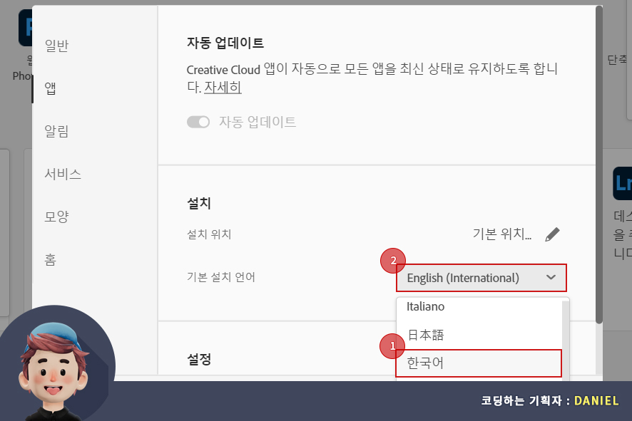 포토샵(photoshop) 2024의 설치 언어를 변경하기 위해서는 어도비 크리에이티브 클라우드(adobe creative cloud) 데스크탑 앱에서 우측상단의 프로필 메뉴를 선택 후 환경설정으로 이동합니다.