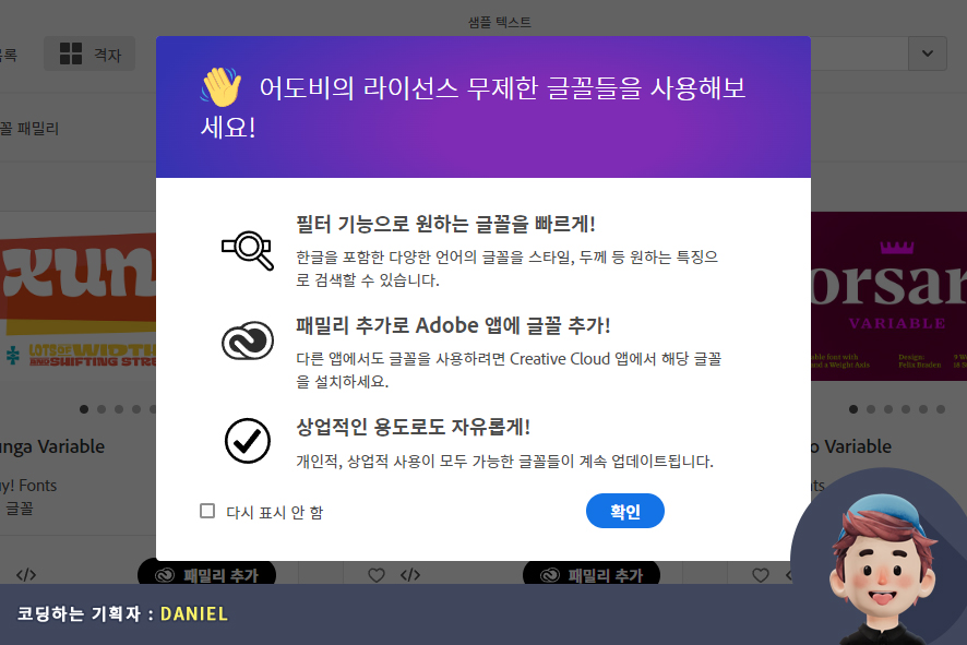 예전과는 다르게 지적 재산권(폰트 저작권)의 중요성에 국민의 의식이 바뀌게 된 만큼 어도비 폰트(adobe fonts)에서는 다양한 회사의 유료 폰트를 무료로 사용하게 해주는 아주 혜자스러운 서비스입니다.