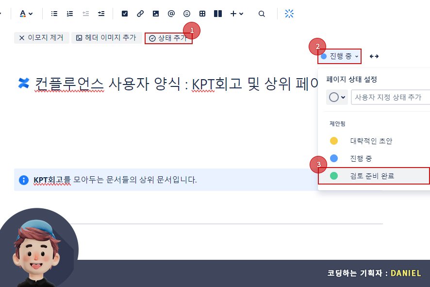 저희 팀은 컨플루언스 문서(confluence page)를 작성할 때에는 이렇게 페이지 상태(add status)를 입력하는데요. 그래야 문서의 완성도에 대해 알 수 있기 때문입니다.