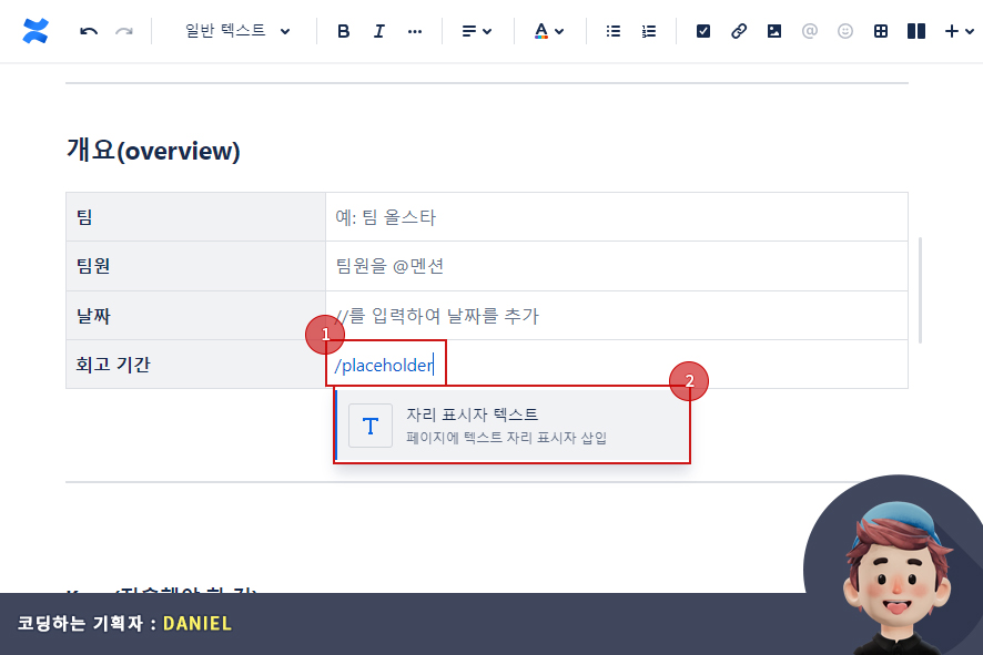 전역 양식(Global Templates)에서만 사용할 수 있는 컨플루언스의 삽입 기능 중 하나인 placeholder text는 html5의 input 요소에 들어가는 속성값과 같이 편집(글쓰기 write, 글수정 modify) 영역에서만 보여지며, 영역을 백 스페이스키로 지우면 한 번에 지워지는 기능으로 템플릿을 작성해 두면 사용자들이 편하게 문서를 작성 할 수 있습니다.