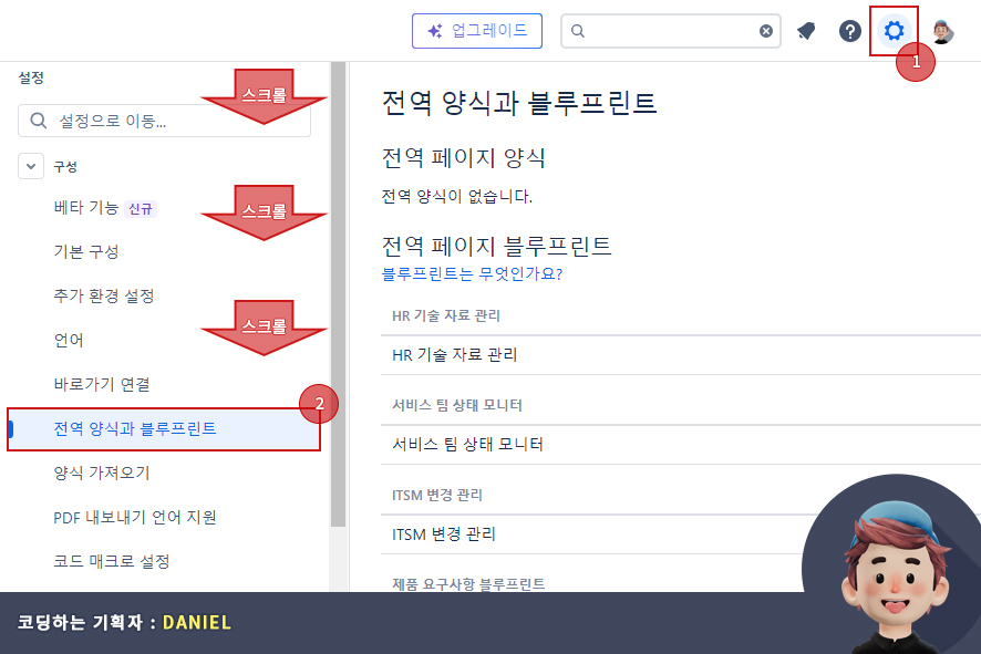 컨플루언스 제품(시스템) 관리자에서 접근 방법은 우측 상단 설정 > 구성 > 전역 양식과 블루프린트를 선택합니다.